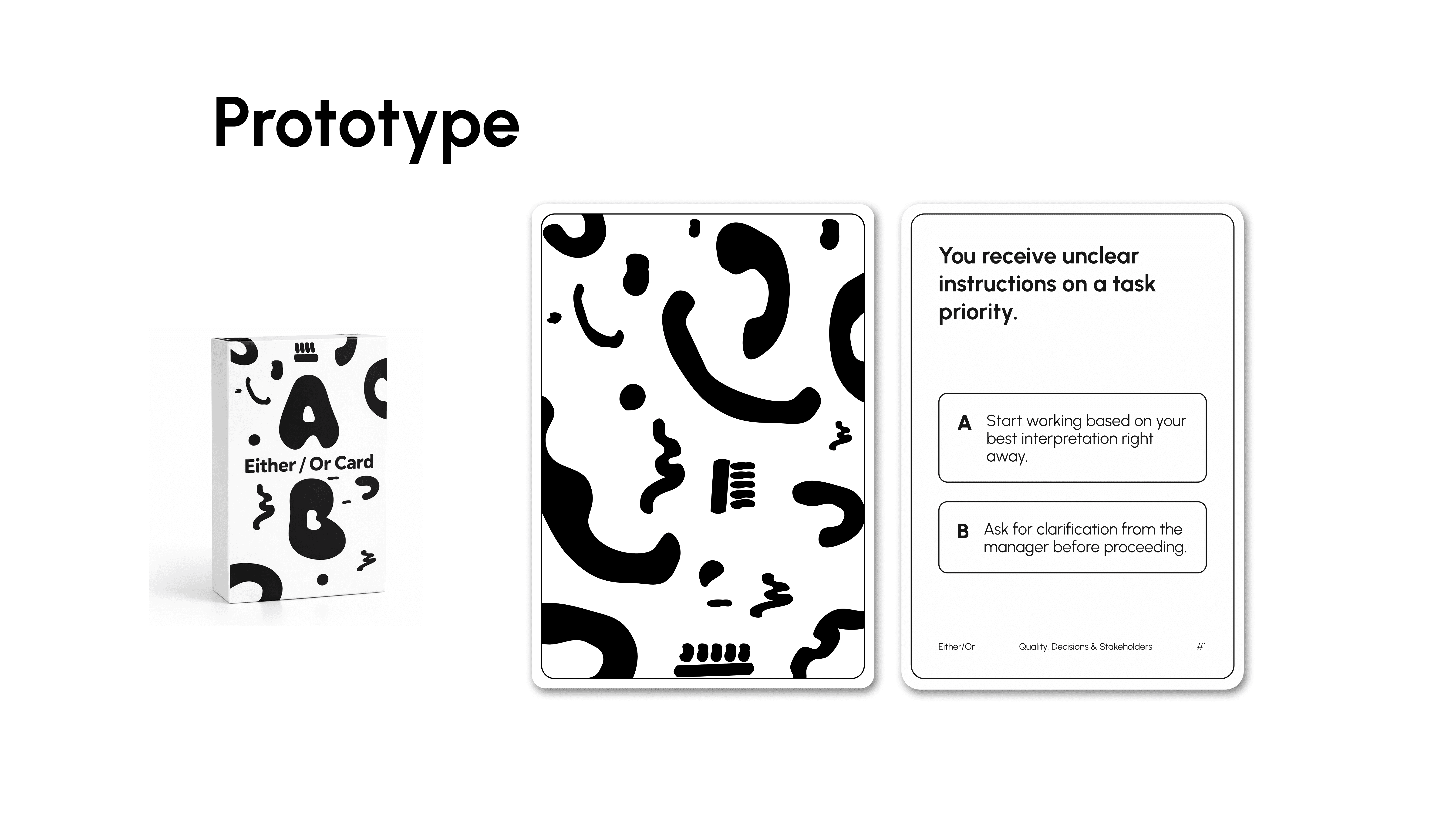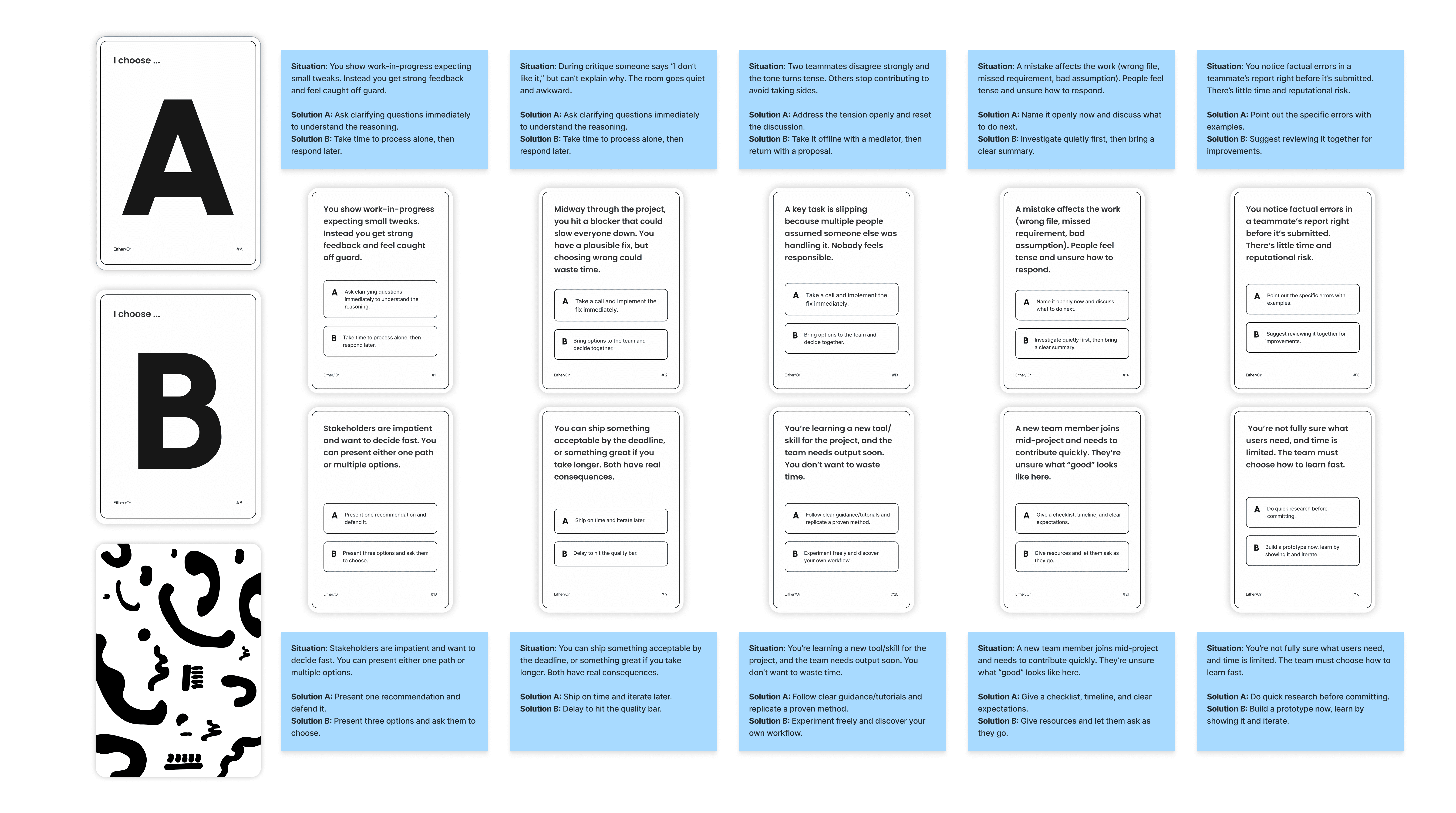 This is a team-based decision-making card tool designed to spark constructive conflict and encourage healthy disagreement. Each card presents a real-world situation with two possible solutions: Option A or Option B. Both options are equally valid but mutually exclusive, reflecting different perspectives, preferences, and thinking styles. The goal is not to find a “correct” answer, but to understand how team members think, debate respectfully, and reach alignment through discussion.