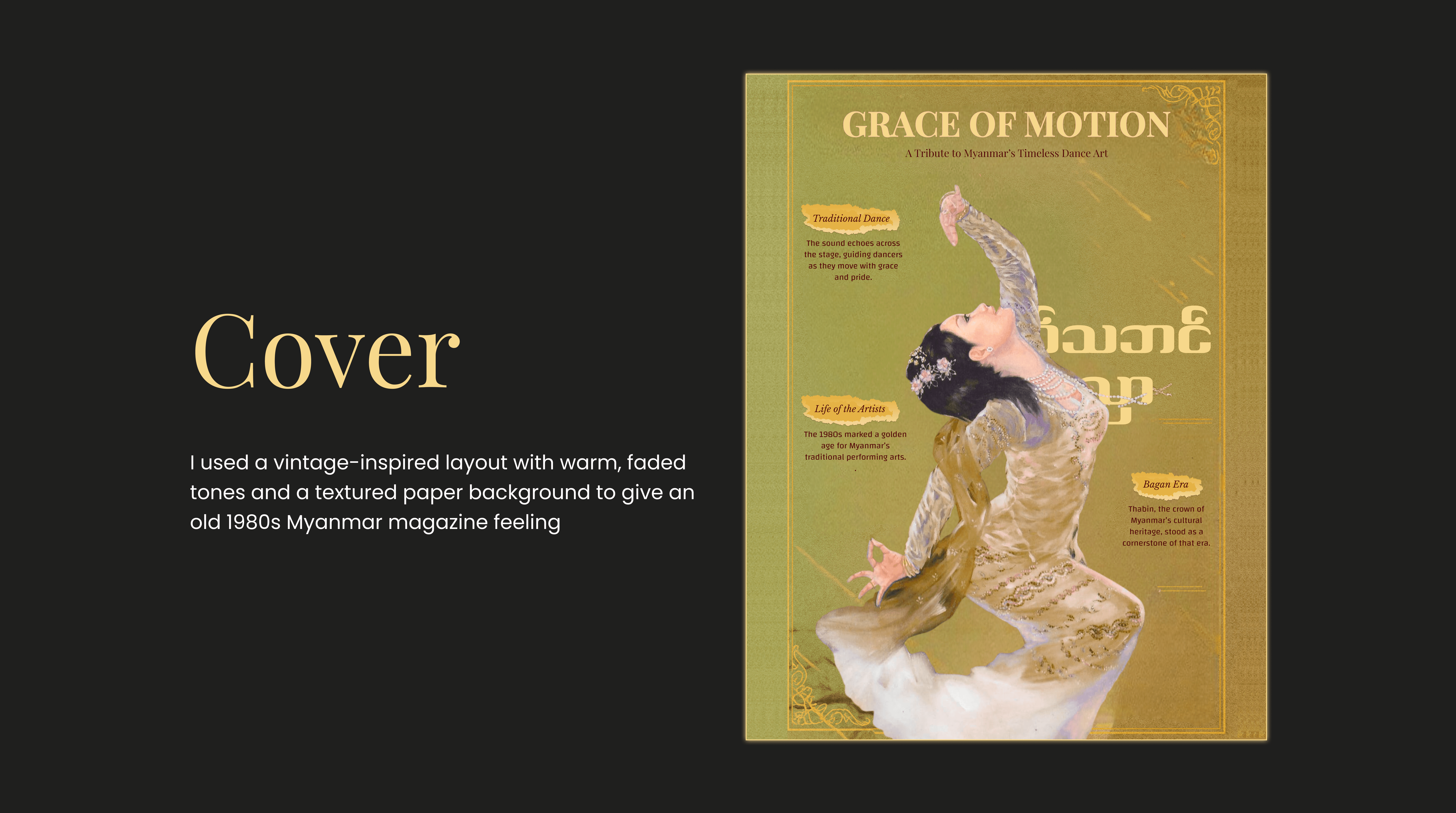 Overall, my design aims to make readers feel nostalgic, proud, and emotionally connected to Myanmar’s performing arts.