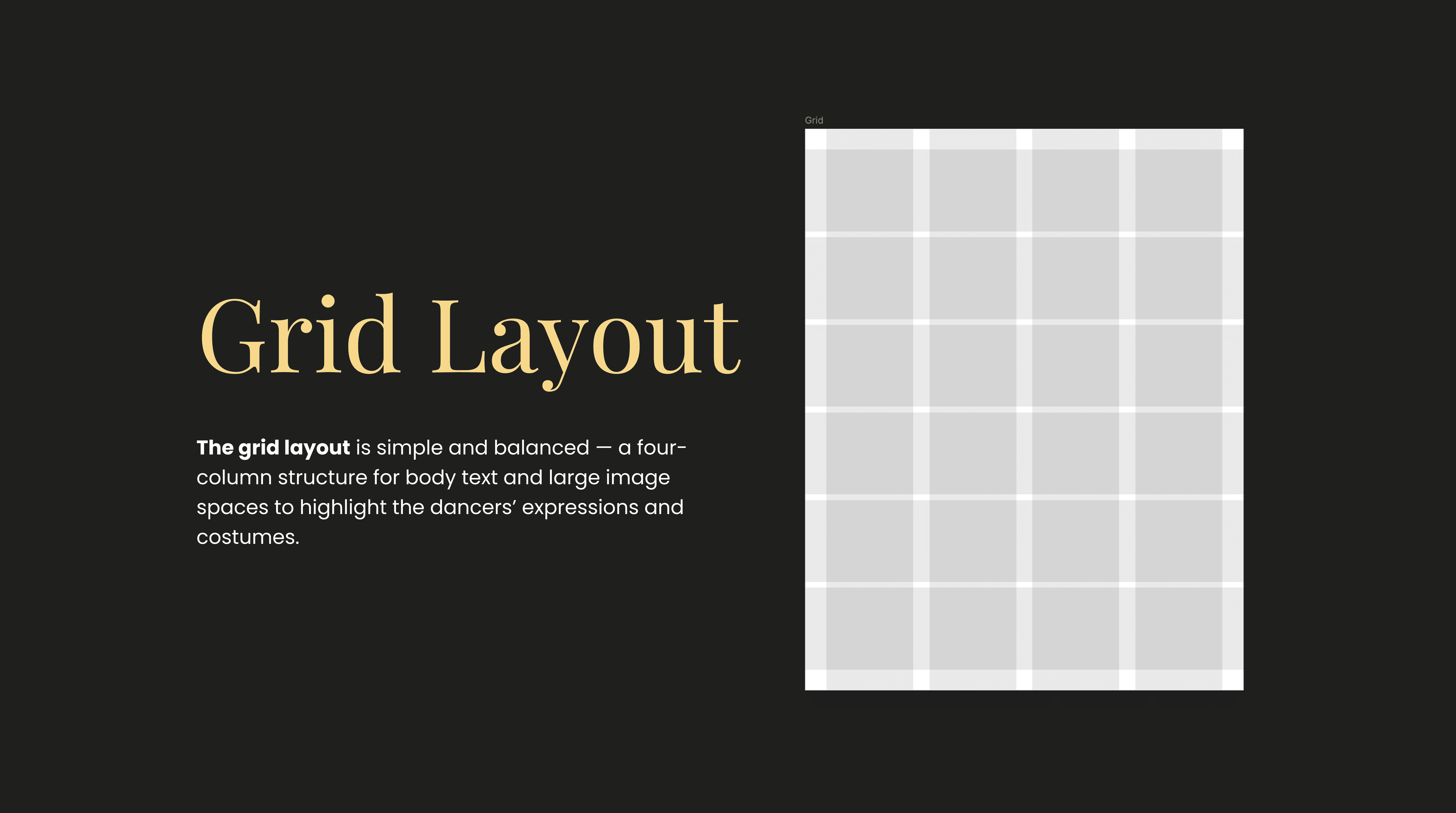 The grid layout is simple and balanced — a four-column structure for body text and large image spaces to highlight the dancers’ expressions and costumes.