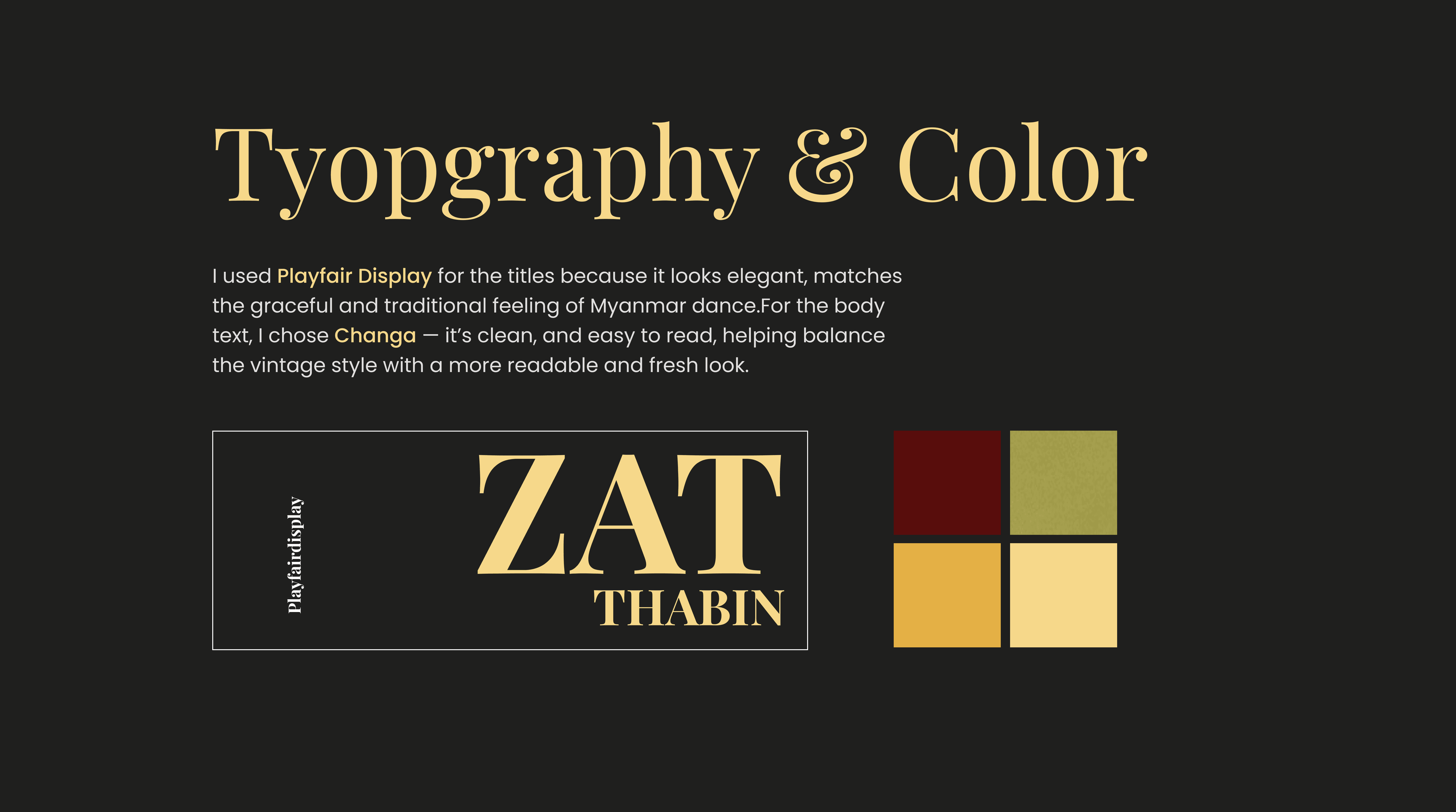 I used Playfair Display for the titles because it looks elegant, matches the graceful and traditional feeling of Myanmar dance.For the body text, I chose Changa — it’s clean, and easy to read, helping balance the vintage style with a more readable and fresh look.