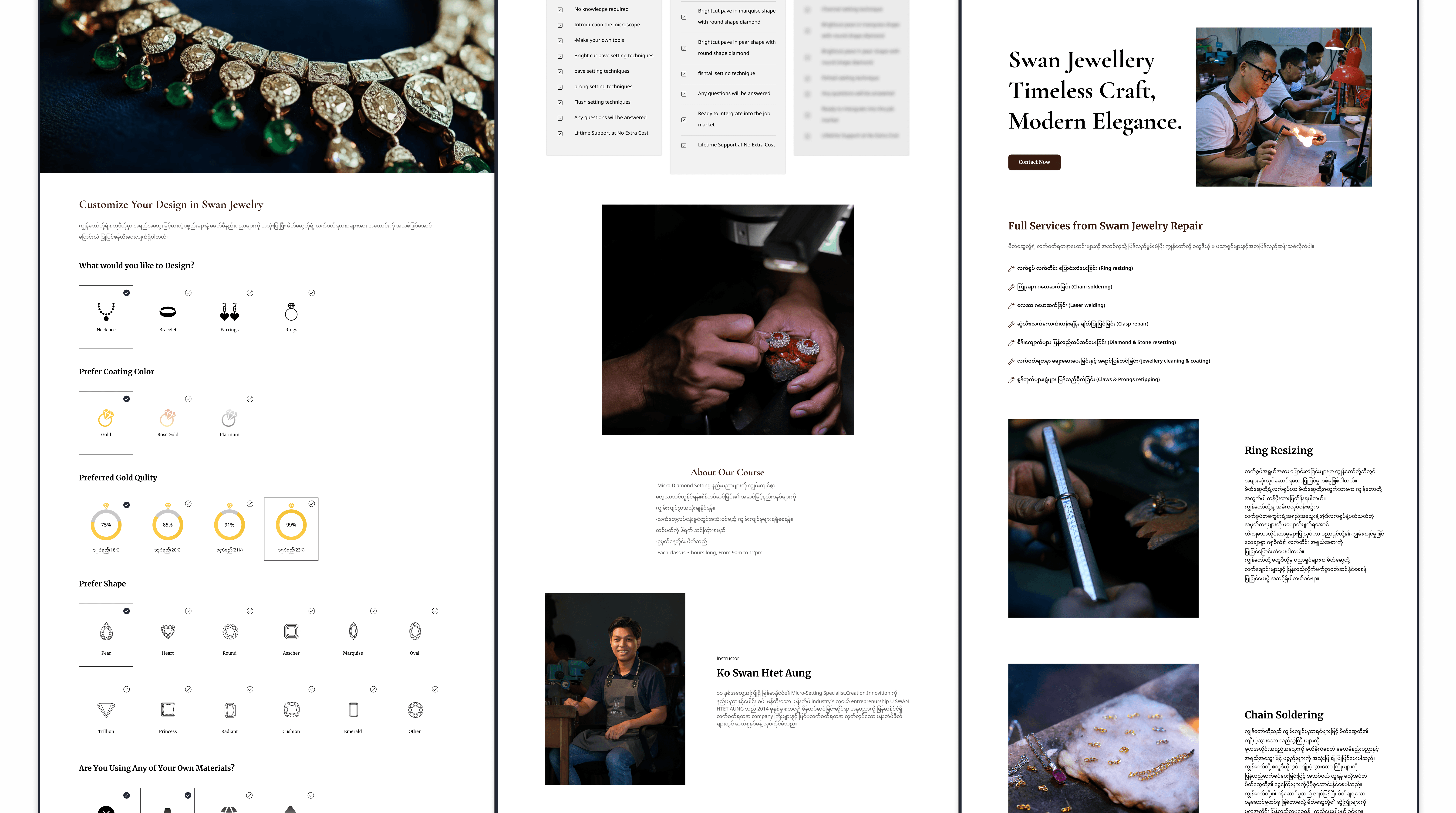 Swan Jewellery Artisan Studio is a jewelry education and artisan brand offering professional courses and handcrafted collections. The website was designed to showcase their training programs, highlight workshop products, and strengthen their premium brand presence online.